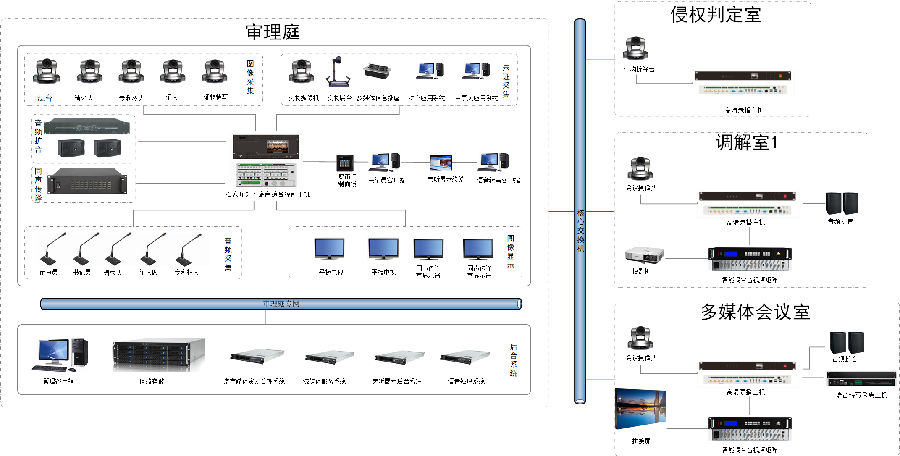 项目包含:1间知识产权审理庭,1间侵权判定室,1间调解室,1间多媒体会议室,使用4台视通科技(AVSYS)多媒体综合管理一体机,实现统一控制管理,音视频调度,会议室互动等应用。
