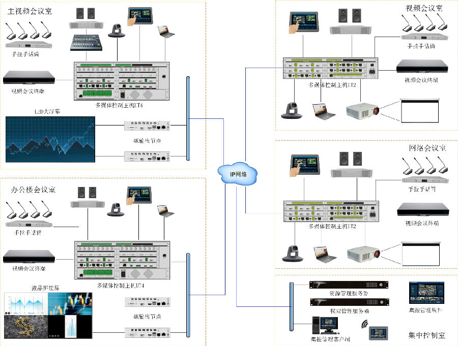 3、会议室间音视频数据共享,在任何一间会议室内,均可将本会议室的音频、视频、计算机画面共享给其他会议室。