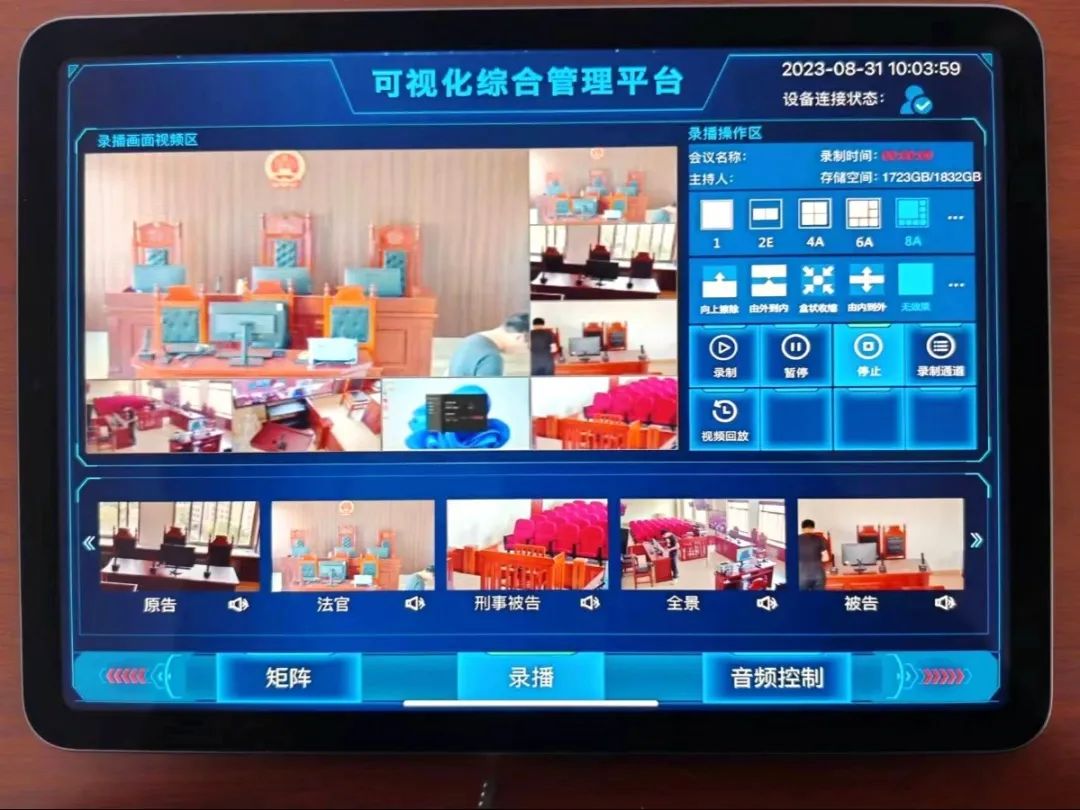 模拟法庭的核心硬件设备采用视通科技高清庭审主机,功能包含:庭审实况采集、示证采集、庭审音频处理、视频无缝切换、庭审集中控制、录播直播、远程提讯终端、多方远程庭审。产品采用ALL-IN-ONE的设计理念,运用热插拔模块化设计,软件可视化操作界面平台,具有安装简便,操作简单、维护容易等优点。