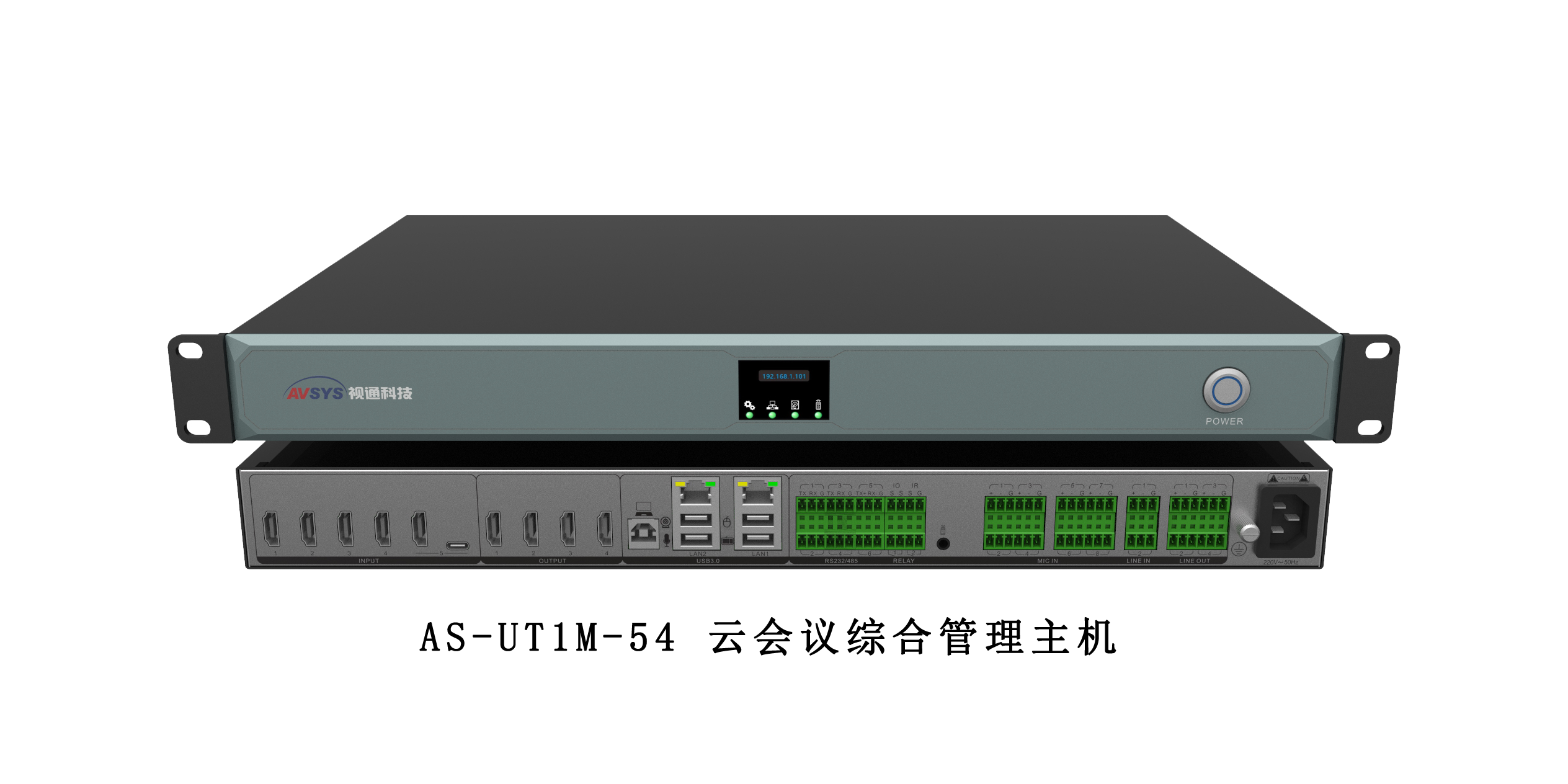 AS-UT1M-54云会议综合管理主机,是一款针对中小型会议室设计的产品,主机集高清视频矩阵,数字音频处理,中控,远程视频会议,录播以及智能抠像功能于一体。主机除对本地会议室设备进行可视化综合管理外,同时还具备与第三方视频会议或MCU多方互联互通的能力,如华为,中兴,Polycom等厂家的视频会议产品。以及主机内置了智能抠像功能,搭配会议摄像机、PC(培训PPT),通过主机内部抠像算法处理将人物抠像画面与PPT画面叠加输出,结合云视频会议软件(如:腾讯、钉钉、Skype、ZOOM)可进行远程会议直播培训。该产品广泛应用于中小型会议室、远程视频会议、会议直播培训等应用场景。